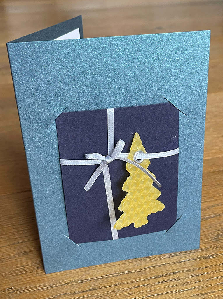 Geschenk und Dekoration zugleich – Anhänger aus Bienenwachs an Satinband auf schimmerndem Grund