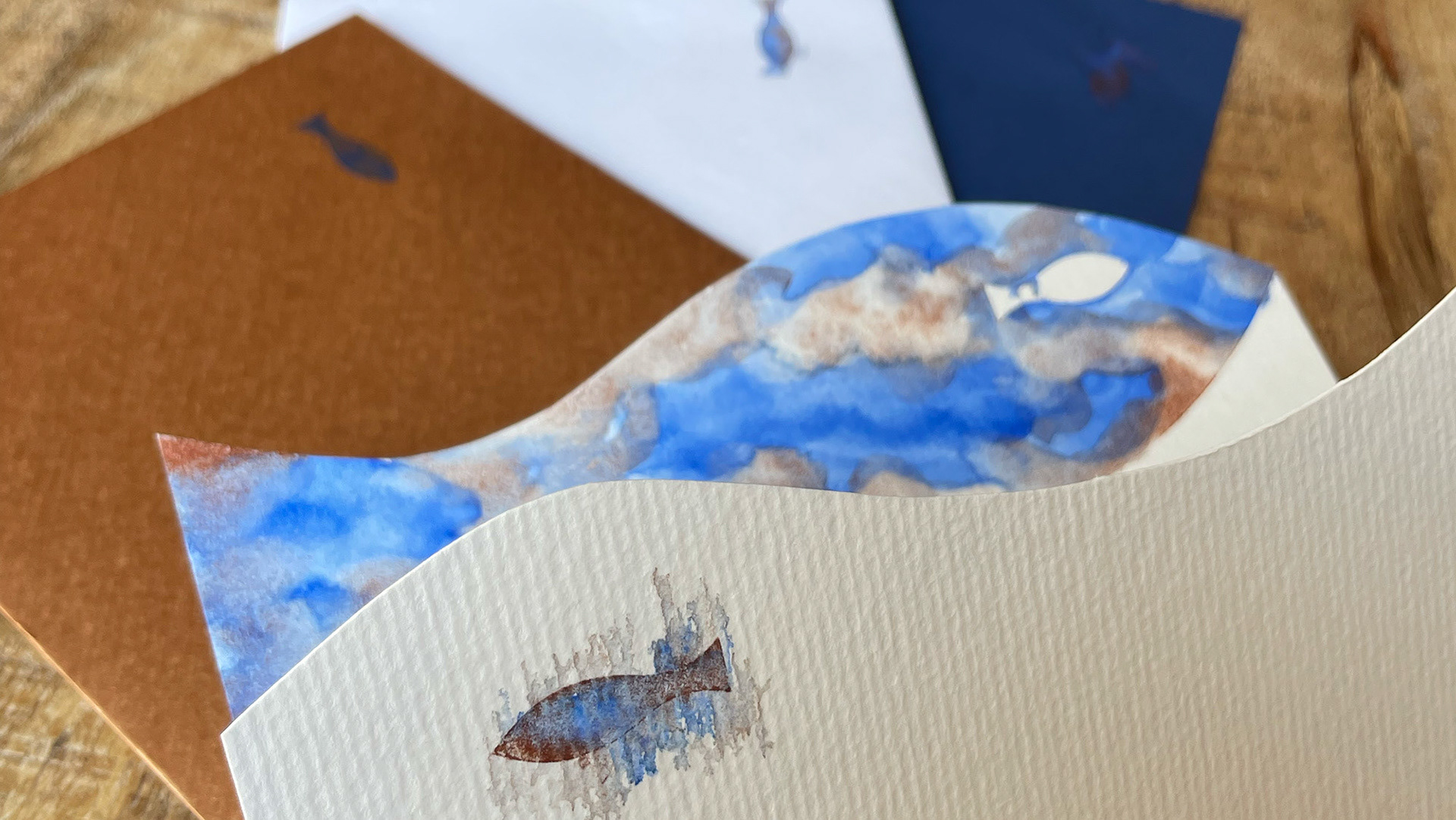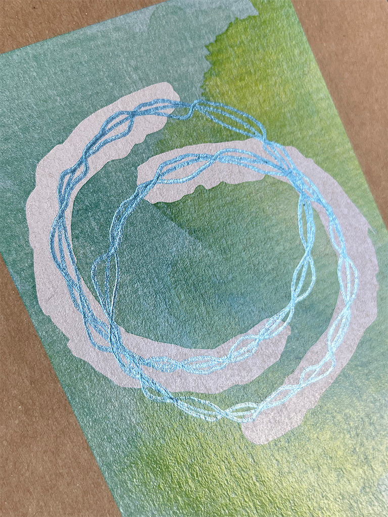 schimmernde Vereinigung: verbundene Ringe und angedeutetes Paar als Weißdruck mit brillanter Farbwirkung auf mattem Kraftkarton