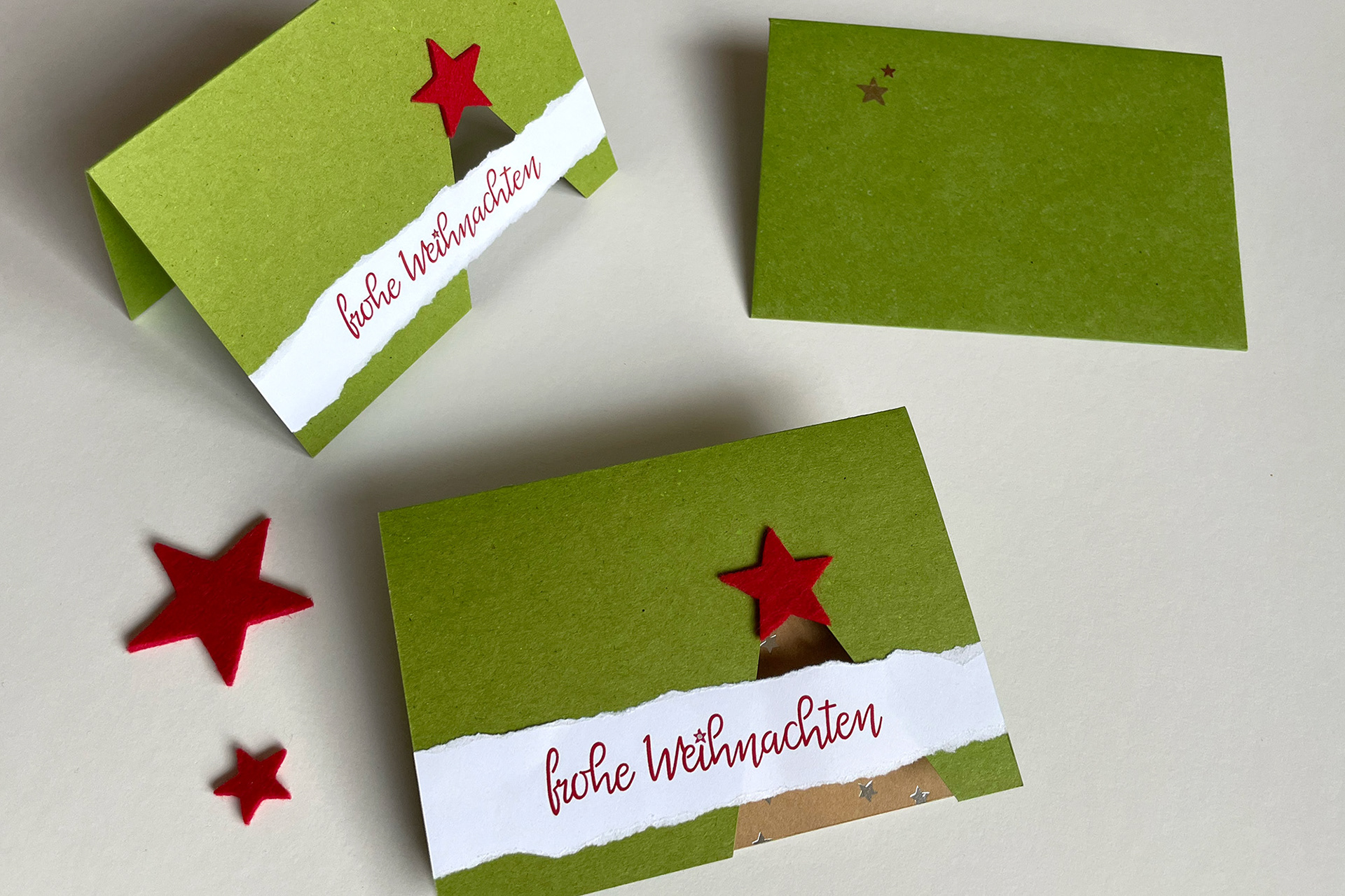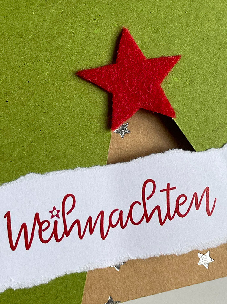 Grünes Naturpapier, Filzstern in weihnachtlichem Rot und Kraftpapier mit Metallsternen kombiniert mit einem Schriftzug auf gerissenem Papier