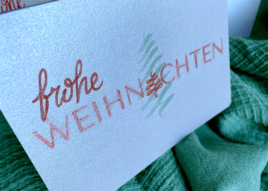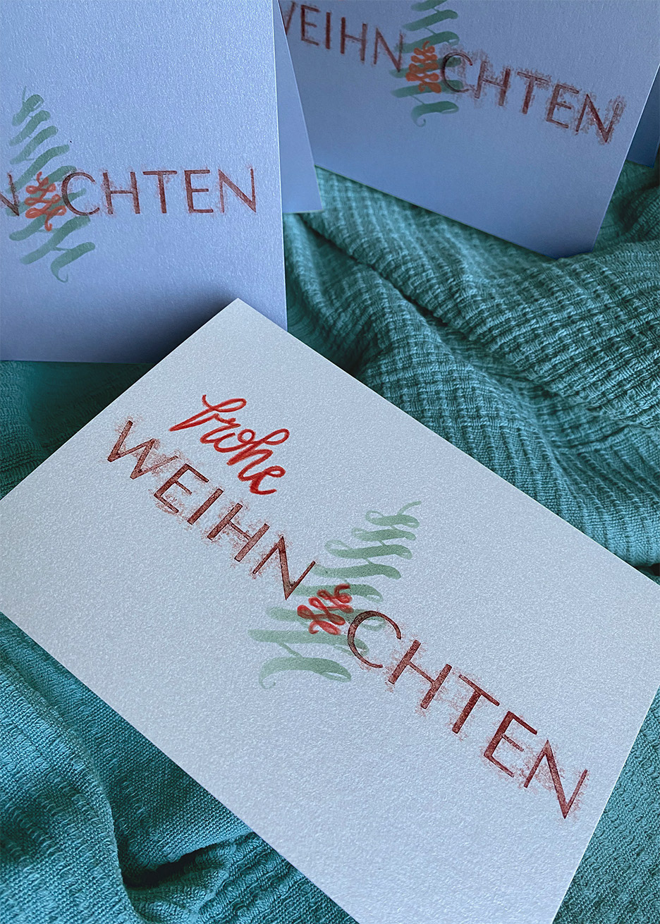 Schimmernde Karte mit Glanz-Lettern und Tannenbaum Ornamenten