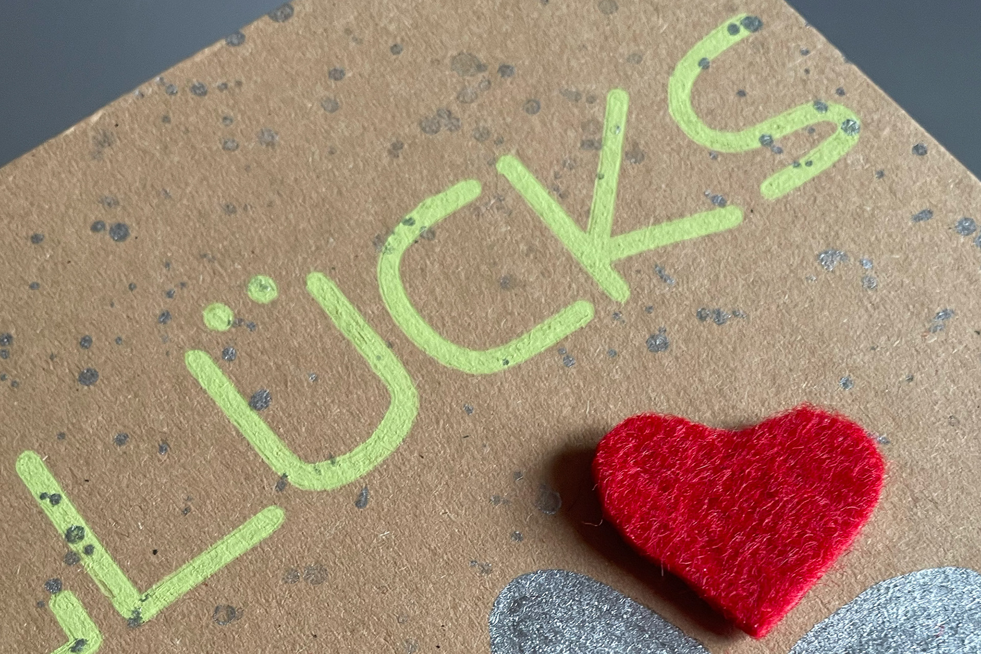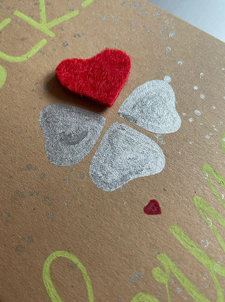 Erhaben prangt das vierte Kleeblatt in Herzform auf der mit silbernen Farbtupfern übersäten Karte