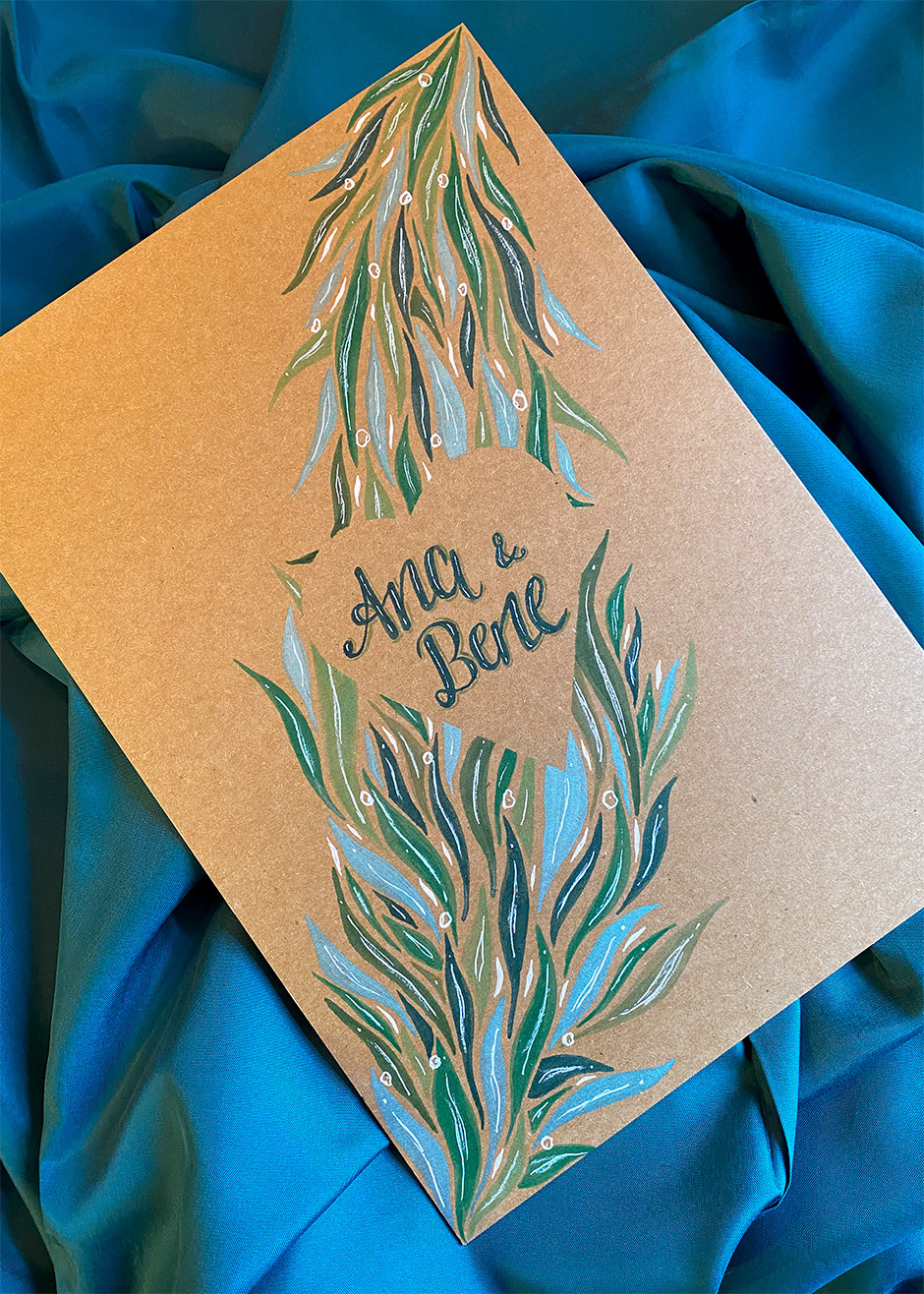 Handgemalte Glückwunschkarte auf Kraftpapier mit matten sowie schimmernden Farben und weißen Highlights