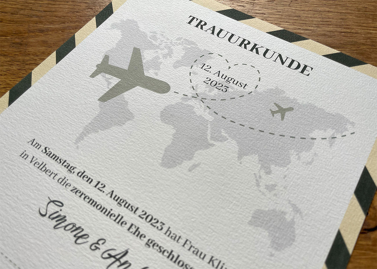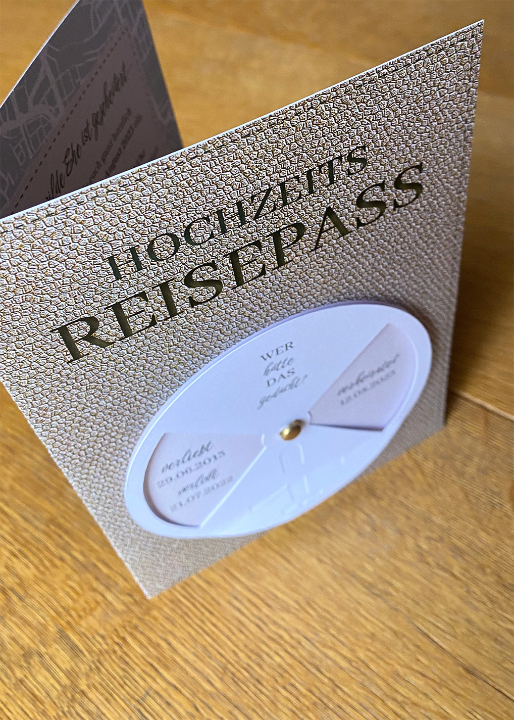 Einladungskarte als Reisepass mit Drehscheibe, eingeprägtem Flugzeug und Innentasche für Antwortkarte, Knigge und Zeitplan. Programm als Faltplan mit Banderole und geprägtem Taschentuch für Freudentränen und Trauurkunde mit Siegel