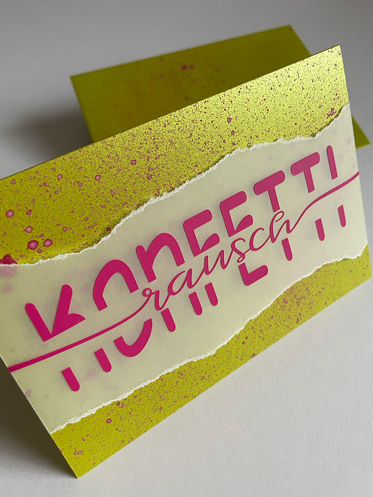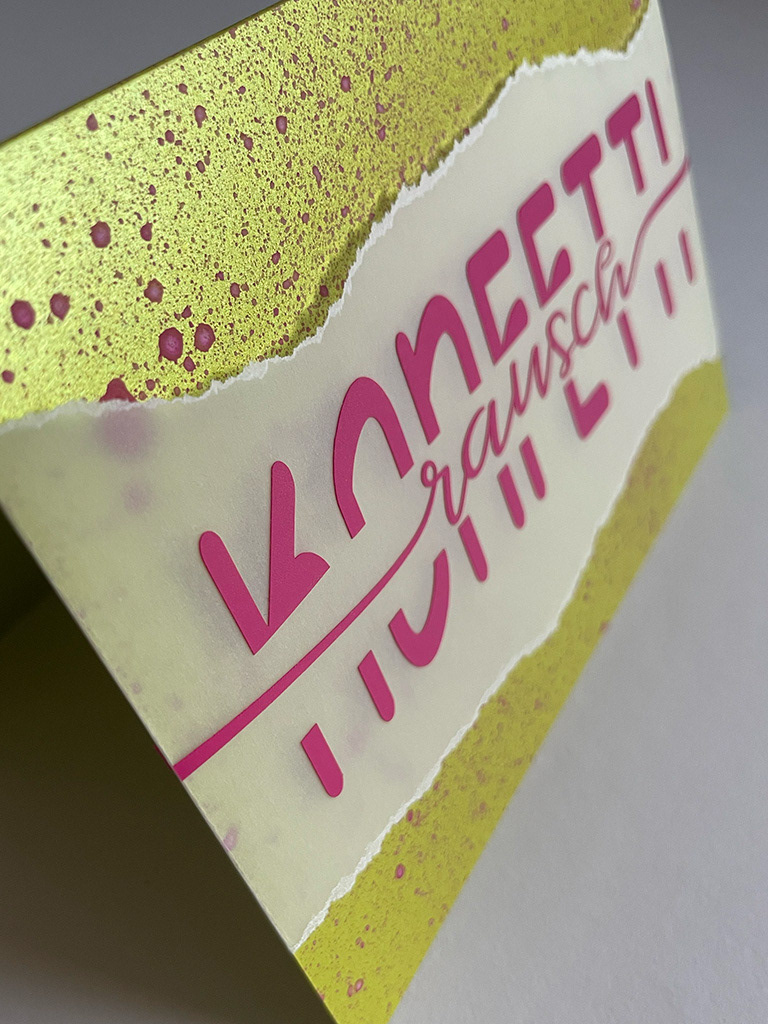 Farbsprenkel Explosion auf seidig schimmerndem Papier mit Schriftzug und gerissenem Transparentpapierstreifen