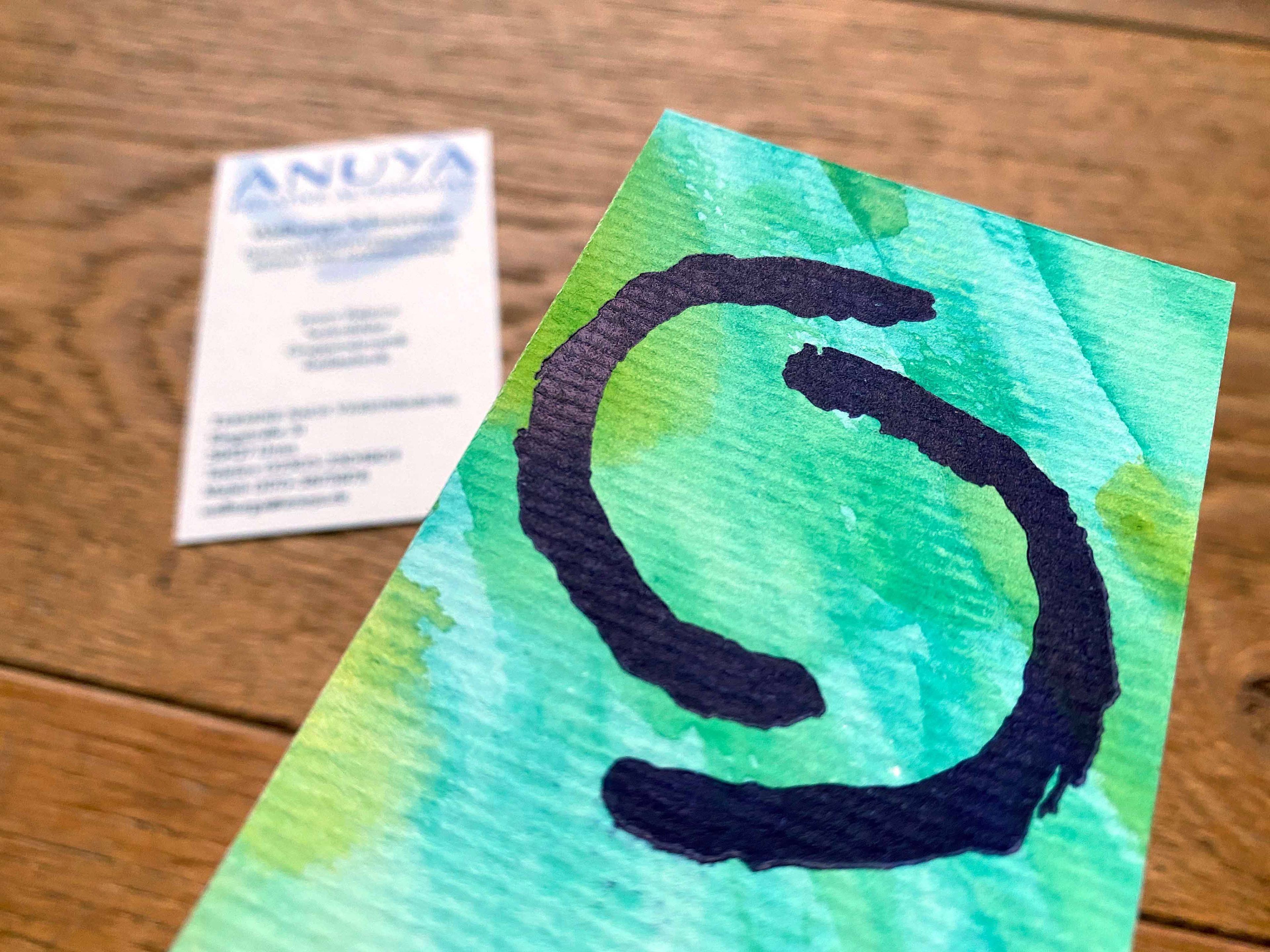 Geschäftskarte mit Prägung und handgemaltem Aquarellhintergrund für eine Kreativtherapeutin