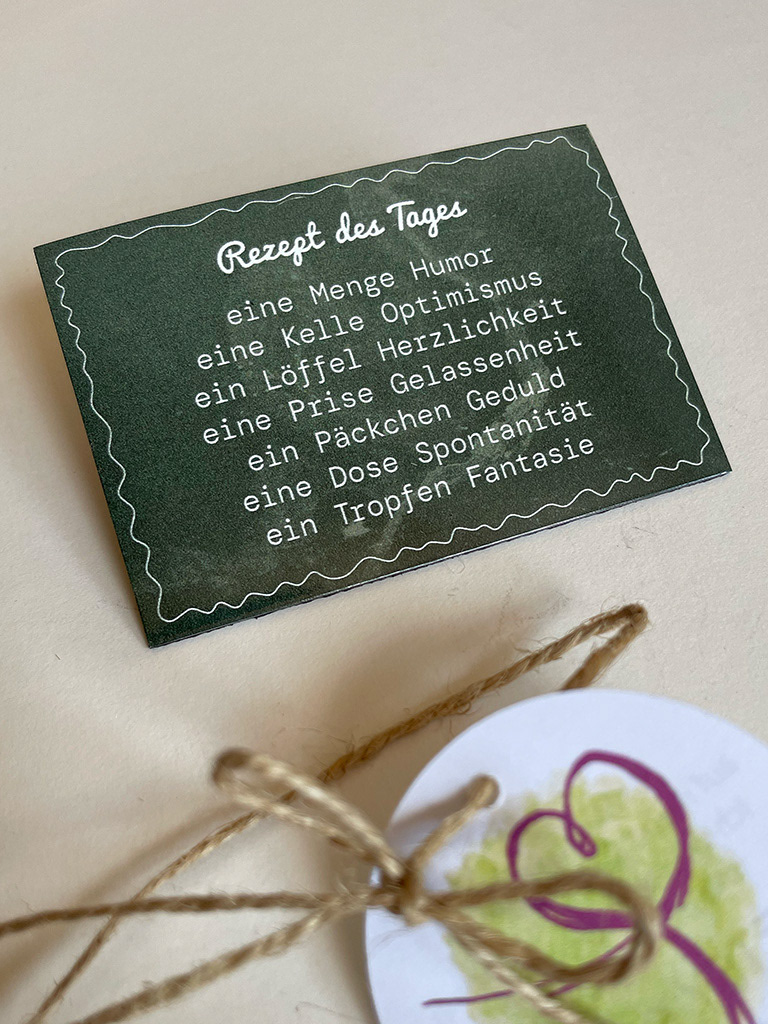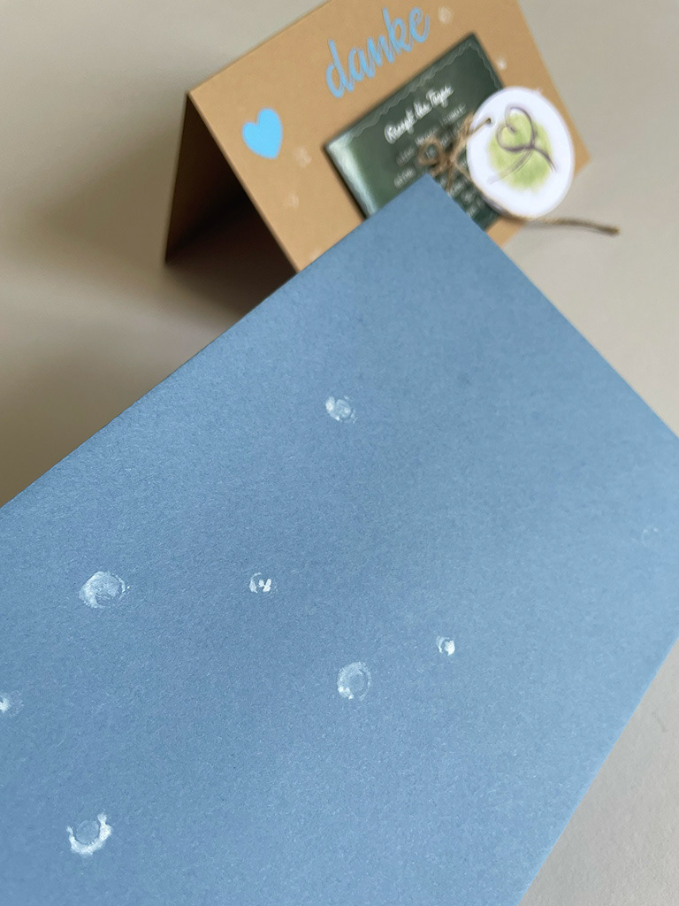 Mini-Präsent danke – Magnetschild auf Kraftpapierkarte umrahmt von zarten Tupfern mit Folienschriftzug