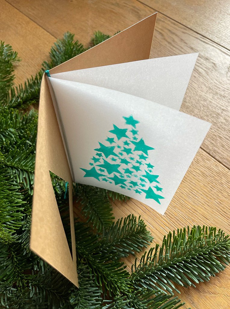 Licht-Schatten-Spiel durch ausgecuttetes Baum-Motiv auf mattem Kraftpapier mit metallisch glänzenden Sternen und zweiter Ebene aus Transparentpapier