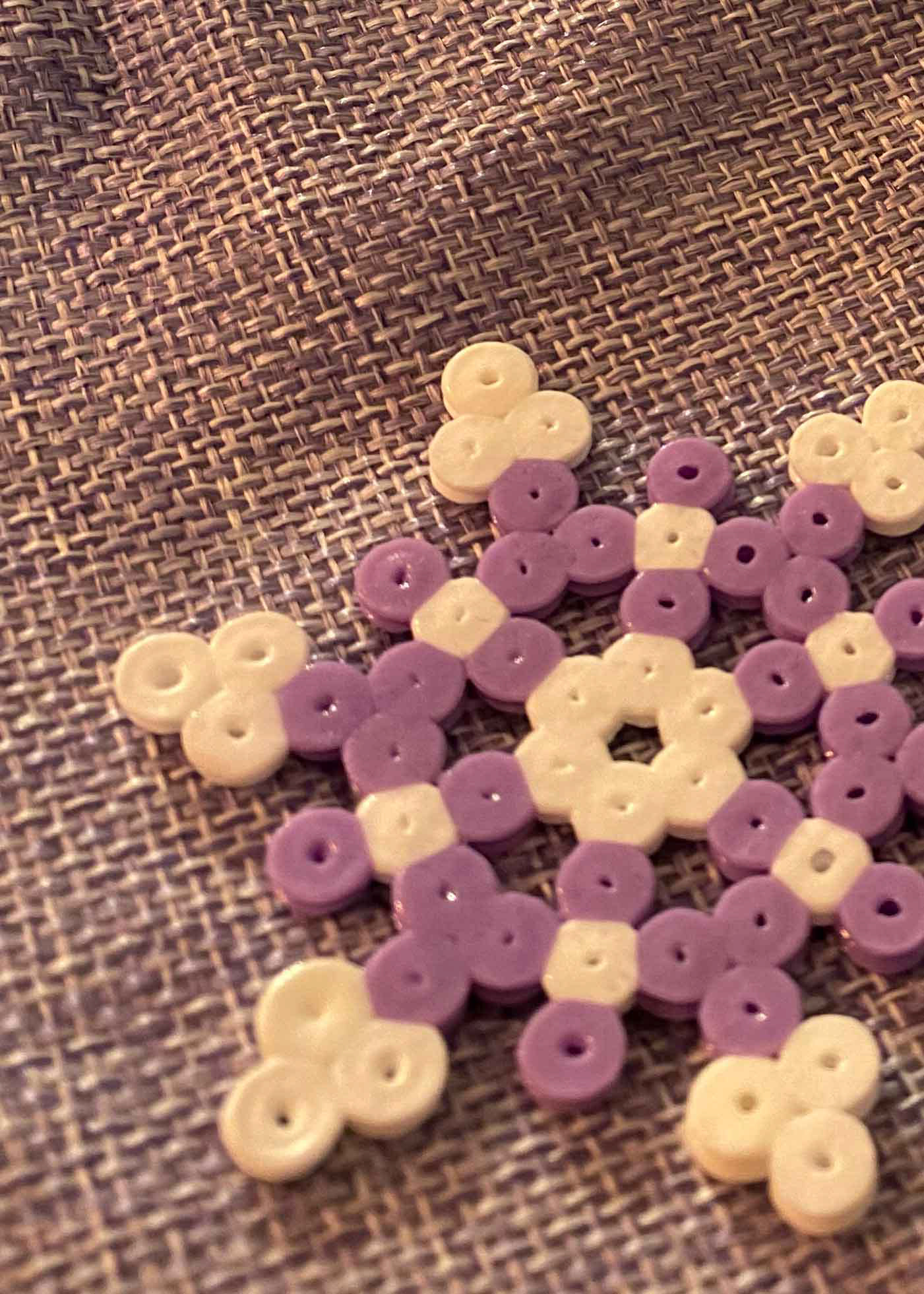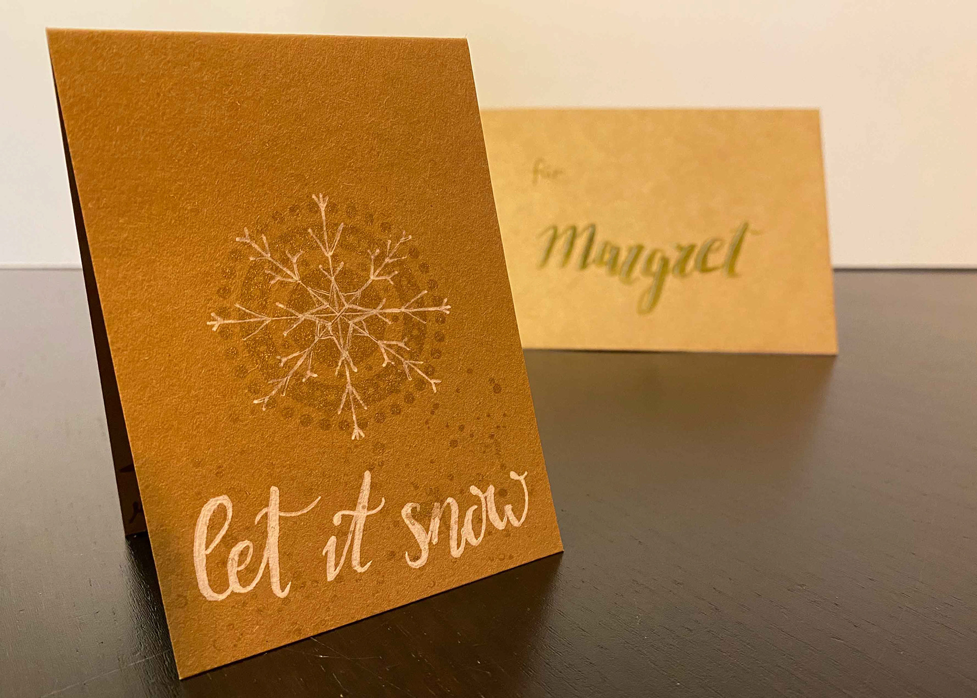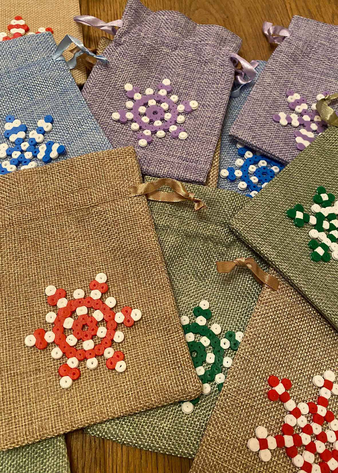 Kraftpapier Karte mit gold-weißer Schneeflocke und weißem Lettering — dazu passendes Säckchen mit Eiskristall aus Bügelperlen