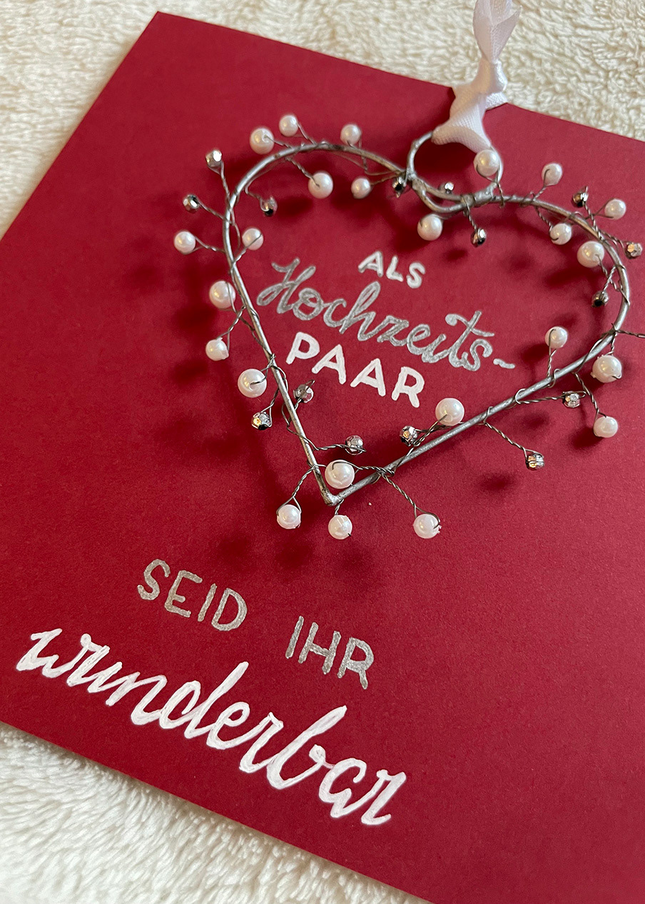 Spruchkarte in dunkelrot mit Draht-Perlen-Herz